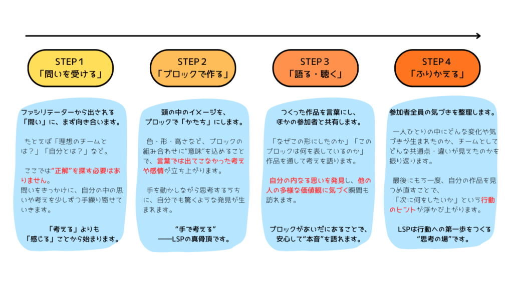 レゴⓇブロックという具体物を使い作品を通じて自分の想いを語る、そして共有し議論を深めるという手法により会議の場を平等にすることを実現したのがLSPです。
